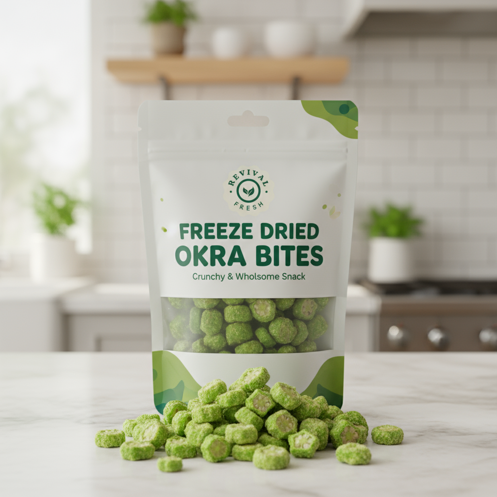 Perfect for snacking on their own or adding a unique crunchy texture to salads, soups, and rice dishes. Revival Fresh’s freeze dried okra bites are lightweight, shelf-stable, and free from preservatives, making them ideal for healthy eating on-the-go or long-term pantry storage.
